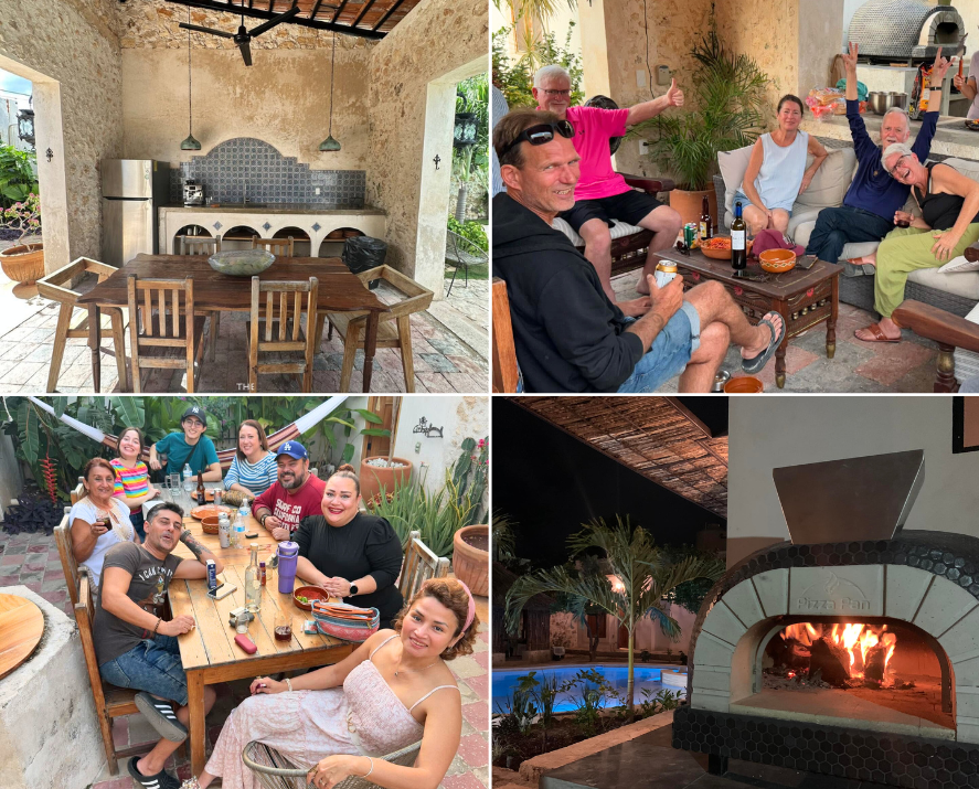 Campeche Mágico features a wonderful outdoor shared space that features a BBQ grill, pizza oven, and a covered area that includes seating, refrigerator, sink, counter space, plates, glasses and more.